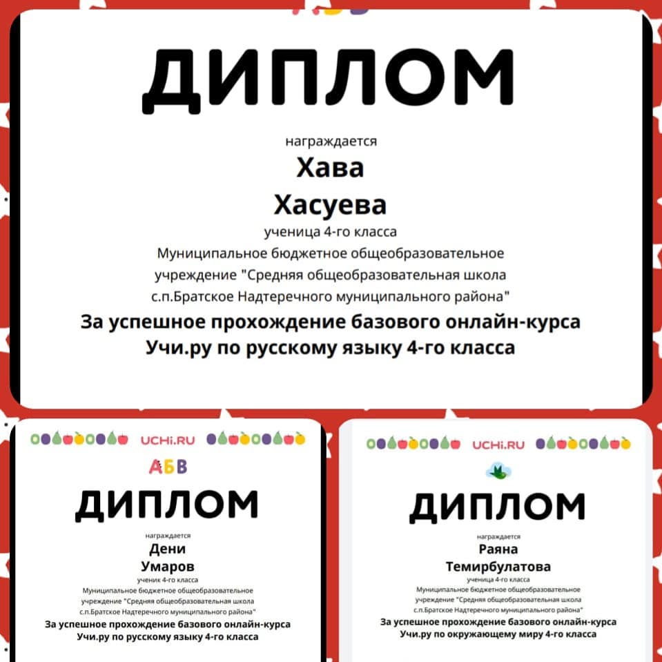 Обучающиеся нашей школы активные участники онлайн-курсов Uchi.ru...Получили дипломы за успешное прохождение базового онлайна-курса uchi.ru по русскому языку и окружающему миру4 "Г" класс. кл.рук.Гидизова М.М.