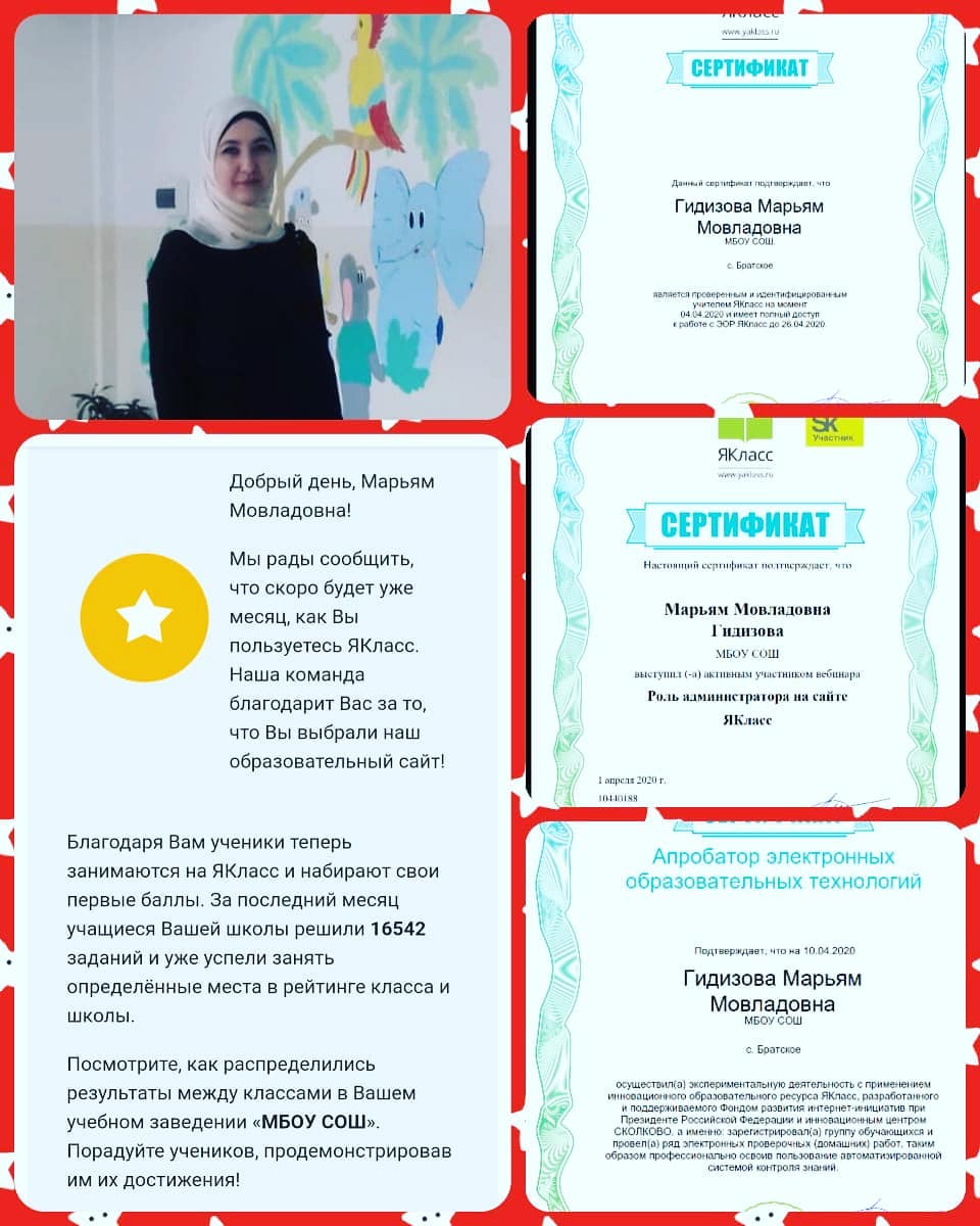 20.04.2020Гидизова Марьям Мовладовна активно участвует в вебинарах образовательного портала ЯКЛАСС. И получает новые знания и навыки применения электронного образовательного ресурса ЯКЛАСС. Эти достижения помогут ученикам достичь высокого качества обучения.Учащиеся 4"г"класса попали в топ ЯКЛАСС. За месяц решили 16542заданий и выполнили 10 проверочных работ, благодаря чему начали продвигаться в рейтинге школ Чеченской республики.