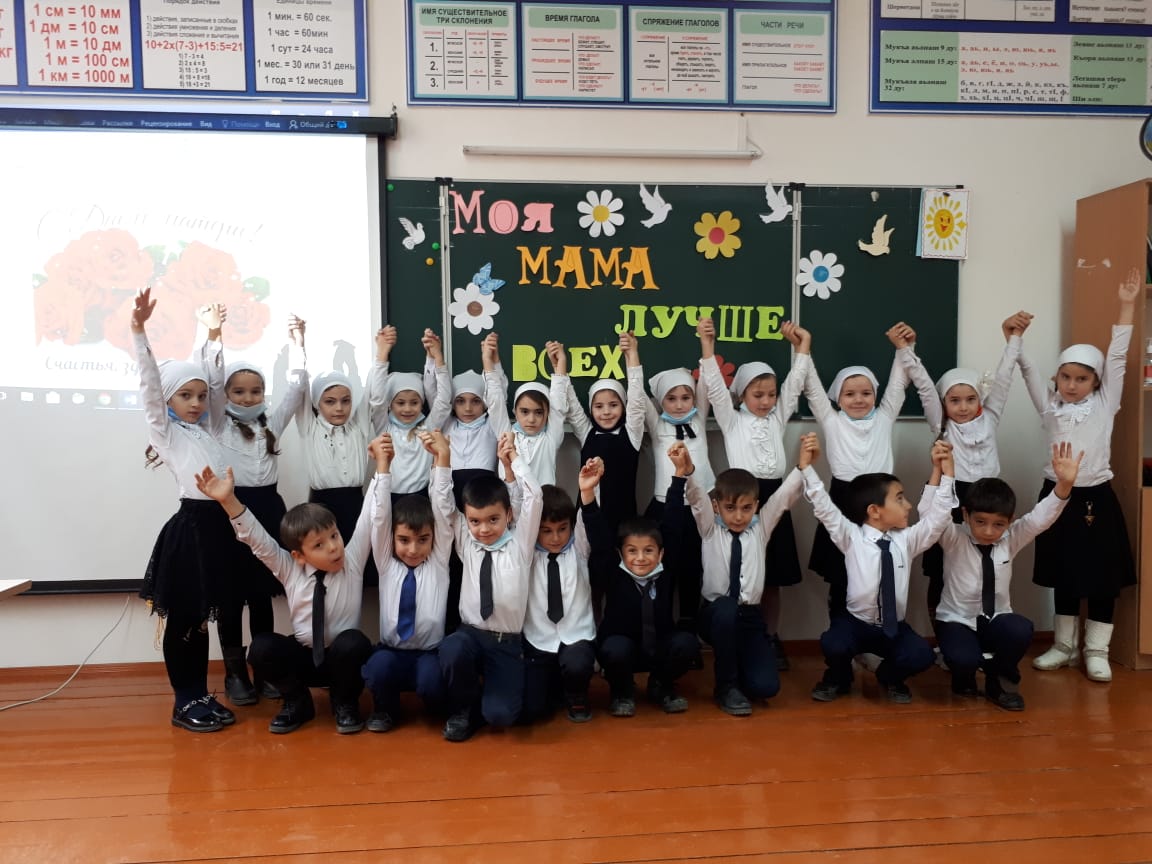 26.11.2020В МБОУ "СОШ с.п. Братское" в 1 А классе проведен открытый классный час на тему: "Моя мама лучше всех". Цель: поддержать традиции бережного отношения к женщине, закрепить семейные устои, особо отметить значение в нашей жизни главного человека-Матери. На мероприятии присутствовали: педагог-организатор - Эдиева М.Г. , учитель начальных классов - Гезуева Л.Р.