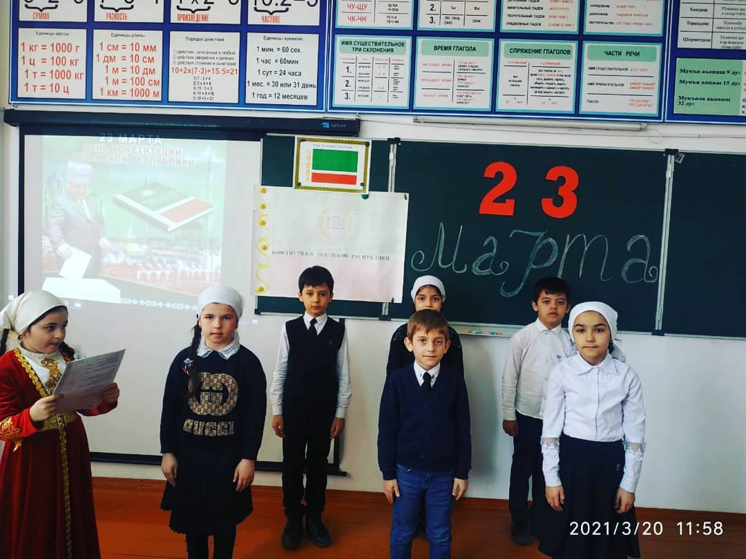 20.03.2021Классный час в 1"г" классе. "23 марта- день конституции Чеченской республики". Провела классный руководитель М.М.Гидизова. Цели: познакомить с историей принятия Конституции ЧР; дать представления о правах ребенка;объяснить детям, что такое "право"; формировать представления о правах и обязанностях школьника.