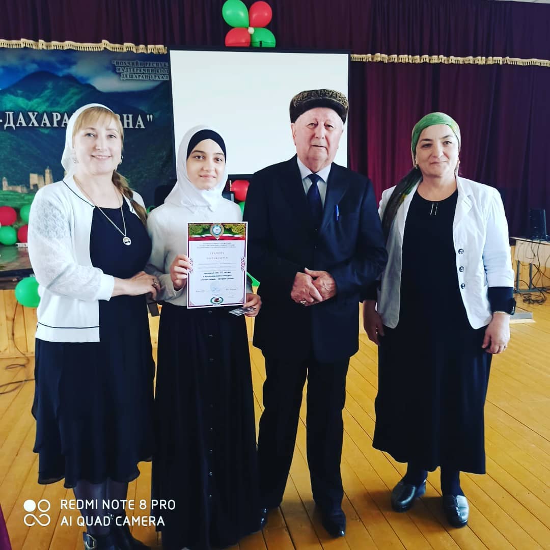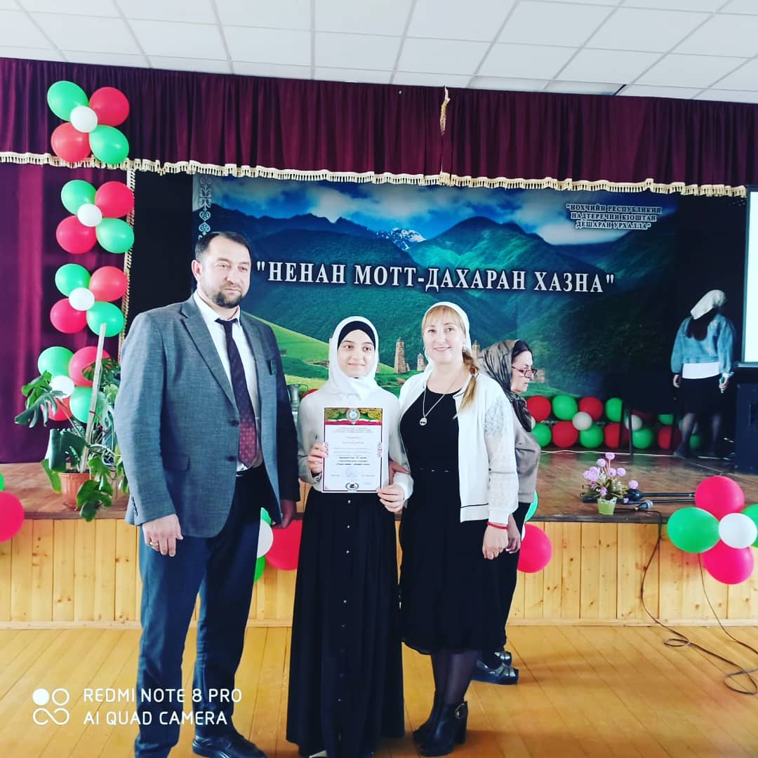 В рамках реализации мероприятий, посвященных Дню чеченского языка состоялся муниципальный конкурс чтецов "НЕНАН МОТТ-ДАХАРАН ХАЗНА" .По итогам конкурса наша обучающаяся 8 б класса Деппиева Раяназаняла III место